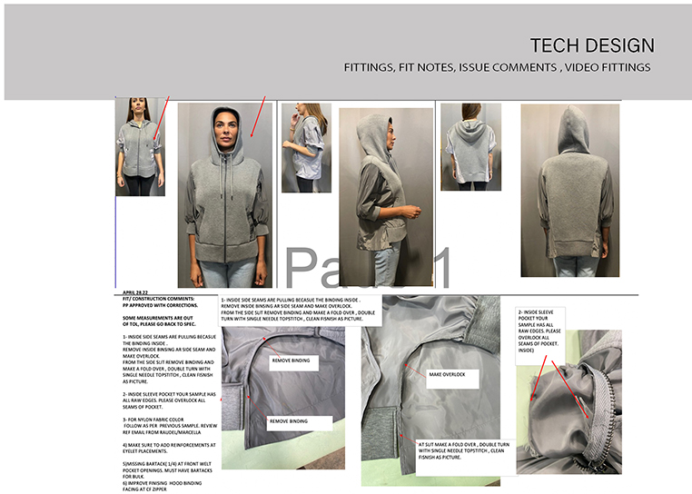 I lead fittings and issue fit comments as well as video fittings. I offer technical solutions to fit issues to improve garment construction. I create tech packs with technical sketches, create BOMs.